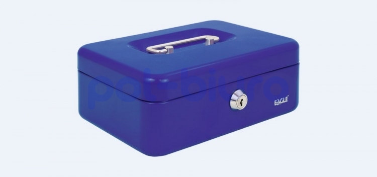 Kasetka na pieniądze Eagle wykonana z metalu, zamykana na kluczyk. Posiada plastikowy wkład na bilon. Kolor niebieski.