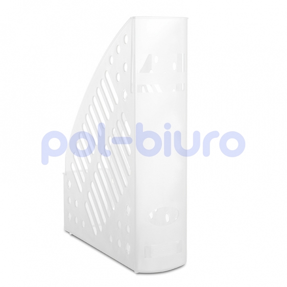 Pojemnik wykonany z twardego, odpornego na pęknięcia polistyrenu o ściętych, ażurowych bokach ułatwiających wkładanie i wyjmowanie dokumentów. Sztywna konstrukcja o zwiększonej stabilności mieści do 700 kartek A4 o gramaturze 80 g/m². Tworzywo przeznaczone do recyklingu, wymiary: 240x70x315mm. Kolor transparentny biały.