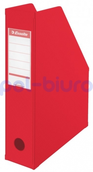 Składany pojemnik wykonany z tworzywa PCV. Posiada na grzbiecie dwustronną etykietę opisową oraz otwór na palec ułatwiający zdejmowanie pojemnika z półki. Przeznaczony na dokumenty formatu A4. Szerokość grzbietu 70 mm. Kolor czerwony.