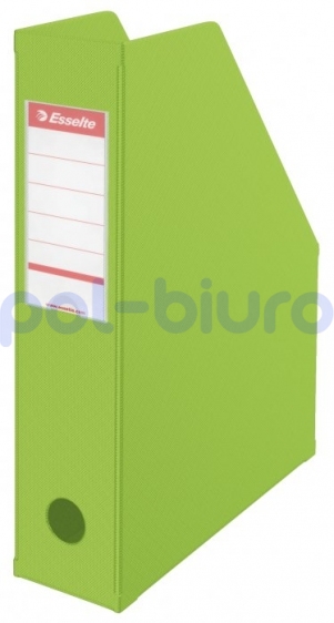Składany pojemnik wykonany z tworzywa PCV. Posiada na grzbiecie dwustronną etykietę opisową oraz otwór na palec ułatwiający zdejmowanie pojemnika z półki. Przeznaczony na dokumenty formatu A4. Szerokość grzbietu 70 mm. Kolor zielony.