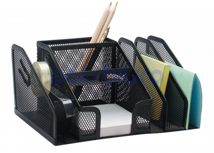 Klasyczny zestaw akcesoriów biurowych. Wykonany z metalowej siateczki pokrytej czarnym, matowym lakierem. Posiada gumowe nóżki, wymiary: 205x145x100mm, kolor czarny.