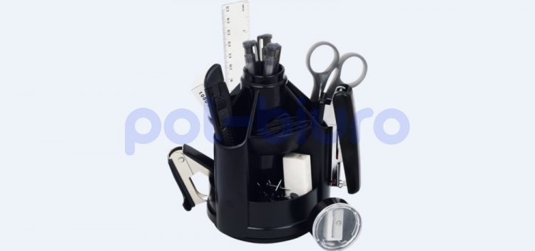 Przybornik na biurko, obrotowy. Wykonany z trwałego tworzywa w kolorze czarnym. Zawiera wyposażenie składające się z 11 elementów : zszywacz, rozszywacz, nożyczki, nóż do papieru, temperówka, linijka 15cm, gumka, długopis(2szt), pinezki (20szt), spinacze (30szt), zszywki (1op).