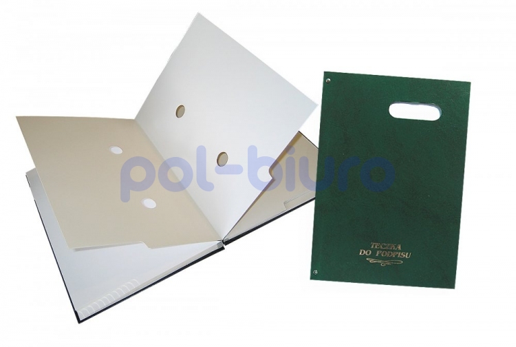 Teczka do podpisu z okienkiem Warta posiada twardą okładkę, oprawioną w okleinę powleczoną PVC - grzbiet harmonijka. Łączenie okładki z blokiem wzmocnione nitami, na przedniej okładce okienko z szybką, pod którą można umieszczać napisy. Blok z kartonu barwionego w masie, zawiera 20 kart z 2 otworami. Kolor zielony.