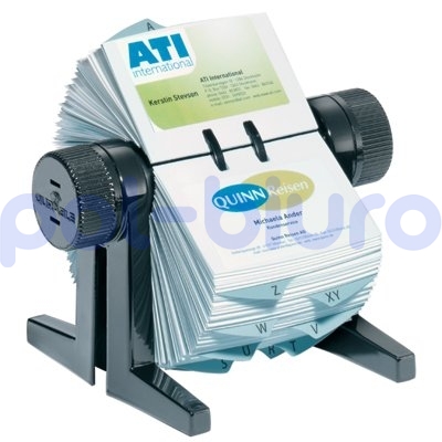 Kartoteka obrotowa z tworzywa sztucznego, wyposażona w 150 obustronnych wkładów na wizytówki. Umożliwia przechowywanie łącznie do 300 wizytówek. Wyposażona 25-częściowe przekładki alfabetyczne A-Z. Mechanizm obrotowy ułatwia odnalezienie wizytówki. Koszulki z wizytówkami można łatwo wyjąć i umieścić ponownie w wizytowniku. Kolor czarny.