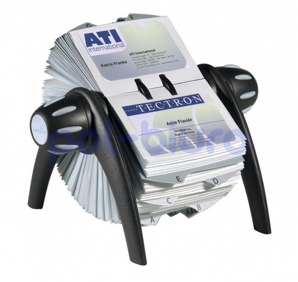 Kartoteka obrotowa na wizytówki. Z wysokojakościowego tworzywa sztucznego o ekskluzywnym wzornictwie. 200 kieszonek o formacie 72 x 104 mm, do obustronnego użytku, dla 400 wizytówek. Alfabetyczny 25-cio częściowe przekładki od A-Z. Uzupełnienie kieszonek poprzez ich łatwe wyjęcie i włożenie. Rozmiar: 21,5 x 12,0 x 18,5 cm. Kolor czarny.
