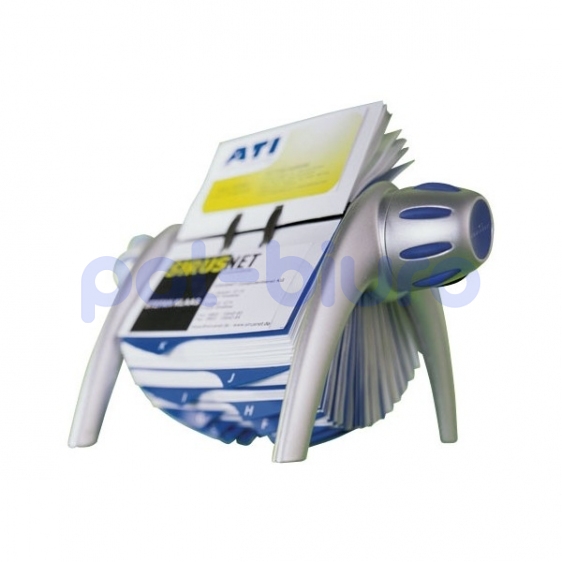 Kartoteka obrotowa na wizytówki. Z wysokojakościowego tworzywa sztucznego o ekskluzywnym wzornictwie. 200 kieszonek o formacie 72 x 104 mm, do obustronnego użytku, dla 400 wizytówek. Alfabetyczny 25-cio częściowe przekładki od A-Z. Uzupełnienie kieszonek poprzez ich łatwe wyjęcie i włożenie. Rozmiar: 21,5 x 12,0 x 18,5 cm. Kolor szary metalik.